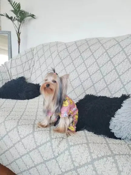 "OMG, love these pet onesies!😍 My little furball just looks adorable in them. They're super comfy and the fit is perfect. The fabric is very breathable, so my pet stays cool even when it's warm outside. Definitely buying more as gifts!🐾❀️"